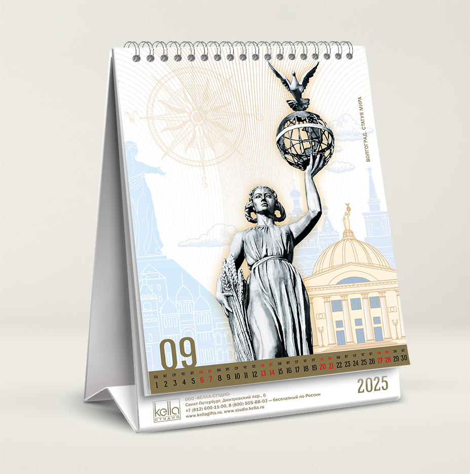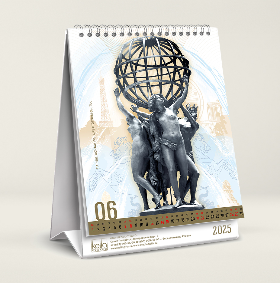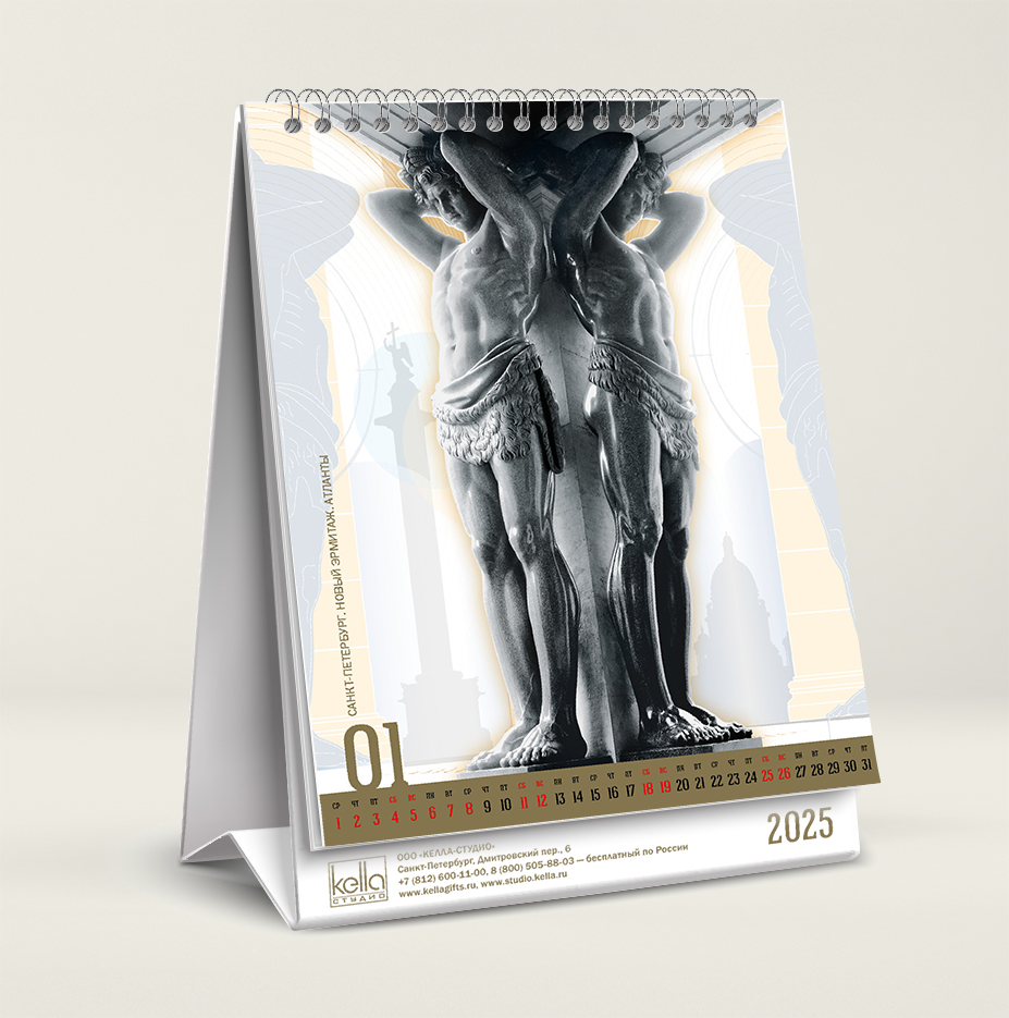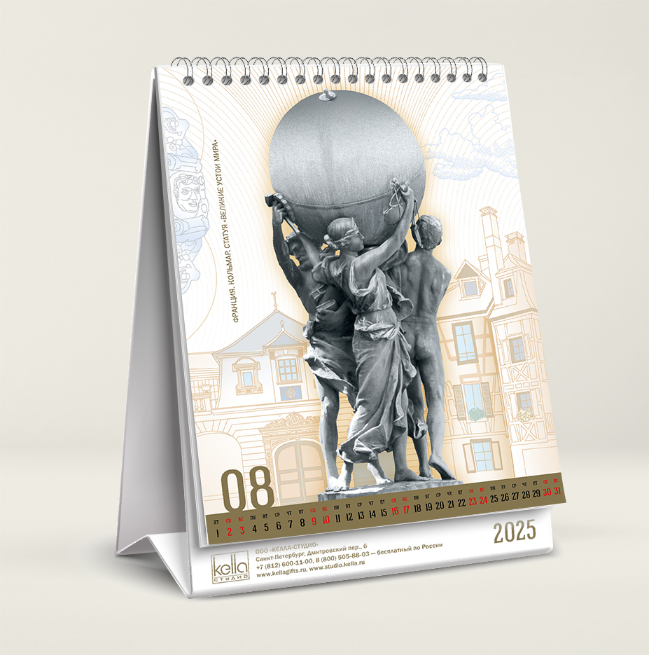 На каждой странице календаря скульптуры — выделены выборочным глянцевым лаком. Этот приём создаёт эффект объёма.
