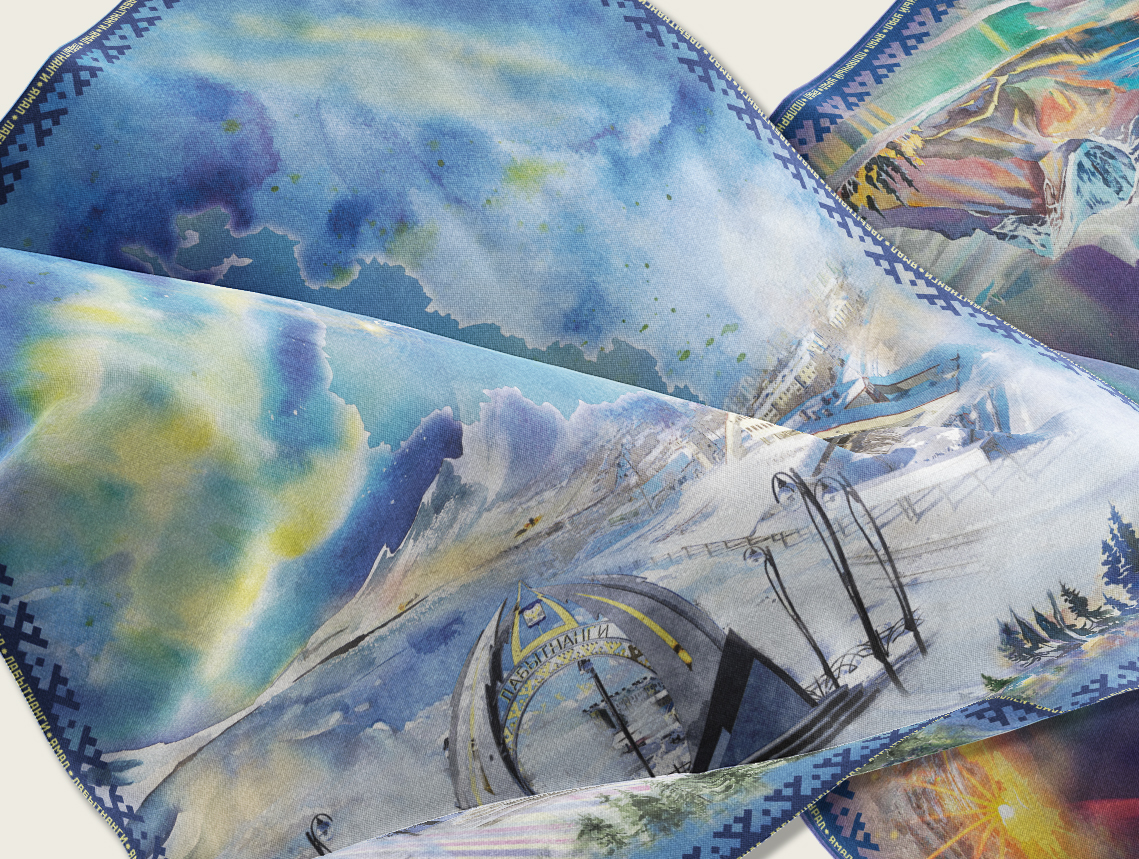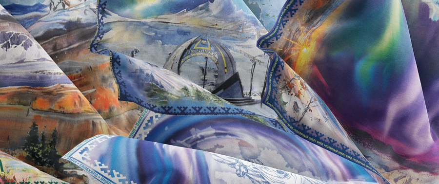 Тематические рисунки платков разработаны в акварельной технике.  Такой платок может стать не только памятным подарком, но и эффектным аксессуаром для любого костюма.